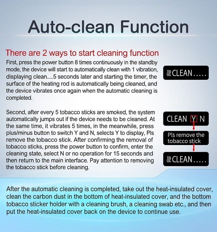 First, press the power button 8 times continuously in the standby mode, the device will start to automatically clean with 1 vibration, displaying clean….5 seconds later and starting the timer, the surface of the heating rod is automatically being cleaned, and the device vibrates once again when the automatic cleaning is completed.