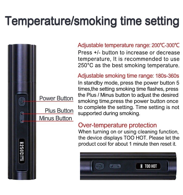Press the +/- button to increase or decrease the temperature, it is recommended to use 250℃ as the best smoking temperature.