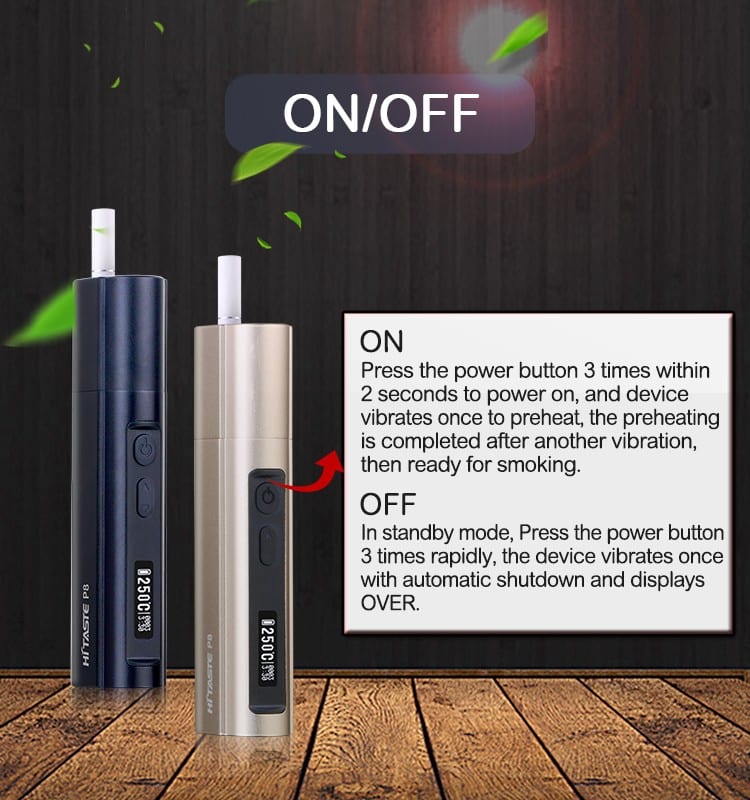 Press the power button 3 times within 2 seconds to power on, and the device vibrates once to preheat, the preheating is completed after another vibration, then ready for smoking.